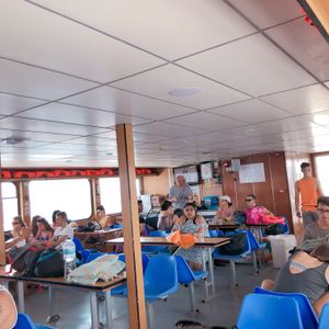 バスでのピックアップはほぼ定刻通りで問題はありませんでしたが、スリーマ港に着いてからの自分たちの乗るボートが分からないのには、口コミで覚悟はしていたものの大変でした。間に合うかハラハラしました。ボートでは屋内ではなくデッキに出ましたが、満員で二人並んだ席を取るのにも一苦労でした。ランチは口コミにあったので、スタッフに予め何時ごろか聞いたら教えてくれ、その時間に配膳場所をウロウロしていると、暫くしてランチ開始の放送が入り、おかげで一番でビュッフェを取ることが出来ましたので、並ぶのに手間取り時間がなく食べれなかった方も居た中でラッキーでした。お安いツアーですがやはり遠回りの、ミコノス島には何時間もかかって到着しましたが、私はラッキーなクルーズだと思い、風景を楽しみながらのボートツアーでした。途中ポパイ村も海側から見ることが出来ました。ミコノス島は滞在2時間弱でしたが、魚がたくさん見れるわけではないので、綺麗なブルーラグーンを堪能するには程よく良い時間だったかも。ロングトリップに否定的な口コミも多いですが、のんびりゆったり船旅で景色を見れると思えば、私にとってはこのお値段で最高のコストパフォーマンスでした。