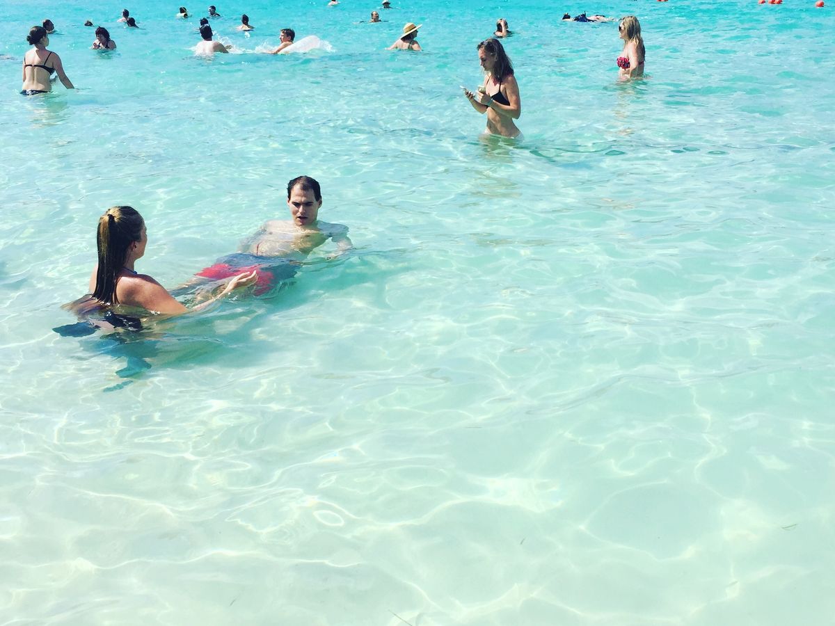 バスで港に月再び乗船。来た時と違う船(キャプテンモーガンの赤いロゴの先程より小ぶりになってたけど間違ってないかなとちょっと心配するもバスのメンバーは案内されていたのでまあいいかと乗り込み、cominoへ。きゃープールの色と叫び声が上がるほど見たことないほど鮮やかなブルー!