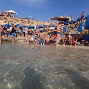 フェリーを降りて救護室(公衆トイレと併設)から左手に、車が通る道(コミノホテルに続く道)とは別の土の道を10分程進んで行くと海岸があり、岩場でゆったり出来るし人も少なく穴場です。