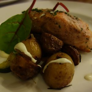 前菜のゴートチーズのフライに続きメインはサーモンをいただきました。付け合わせの山盛りローストポテト以外は量も多すぎることなく、おいしくいただけました。デザートは8種類くらいの中から好きなものをチョイス。レモンチーズケーキにしました。店員さんたちもみんな感じよかったです。そしてここの化粧室には、日本のショッピングセンターにあるような「トイレ掃除チェック表」があってびっくりしました。朝夕の2回のチェックのようですが清潔に気を付けているんだなという安心感がありました。食事はテラス席が何だか恥ずかしくって店内で食べましたが、よく見るとほかのお客さんたちは全員がテラス席!ここはやはり外で食べるべきだったと食後に後悔。