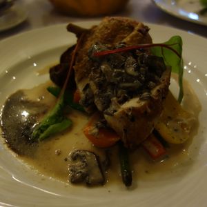 ディナーは、①本日のスープ、②ローストチキン マッシュルームソース ローストポテトと添え野菜、➂本日のデザート、④コーヒーか紅茶というコースでした。
