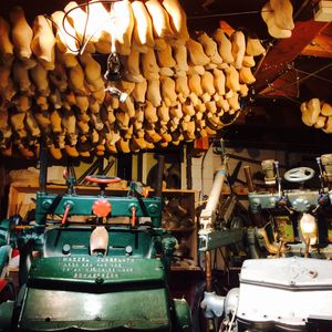天井にはまだ塗装されていない木靴が万国旗のように一面に吊り下げられており、なかなかの壮観です。木靴もなかなか履きやすくお土産にもオススメだと思いますが、そこそこ値段もするし結構かさばるので旅が始まったばかりの私たちには、少し荷物になってしまうのでこれは見送りました。木靴屋さんでは木靴を使った面白いオブジェがお店の周りに飾られており、また近くの道路標識は牛が木靴を履いているという面白いデザインでした。