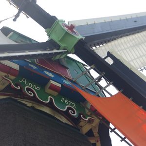 風車は、緑とオレンジとグレーを基調としており、落ち着いた中にもなかなかカラフルで楽しいデザインです。近くで見る風車は、日本のハウステンボスなどで見た印象よりも大きく、回転速度も思ったよりもずいぶん早く回っています。メインの風車は5つ6つくらいでしょうか、そのうち4つくらいの風車が見学可能な工場として稼働しているもので、粉挽き行場、オイル工場、造船工場して動いてるそうです。ツアーではそのうちオイル工場となっている風車を見学しました。