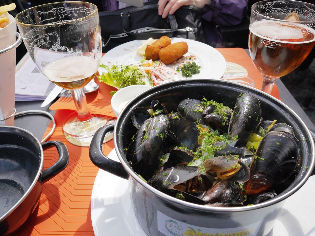 鐘楼の見えるレストランで食べたバケツいっぱいのムール貝やベルギービール。