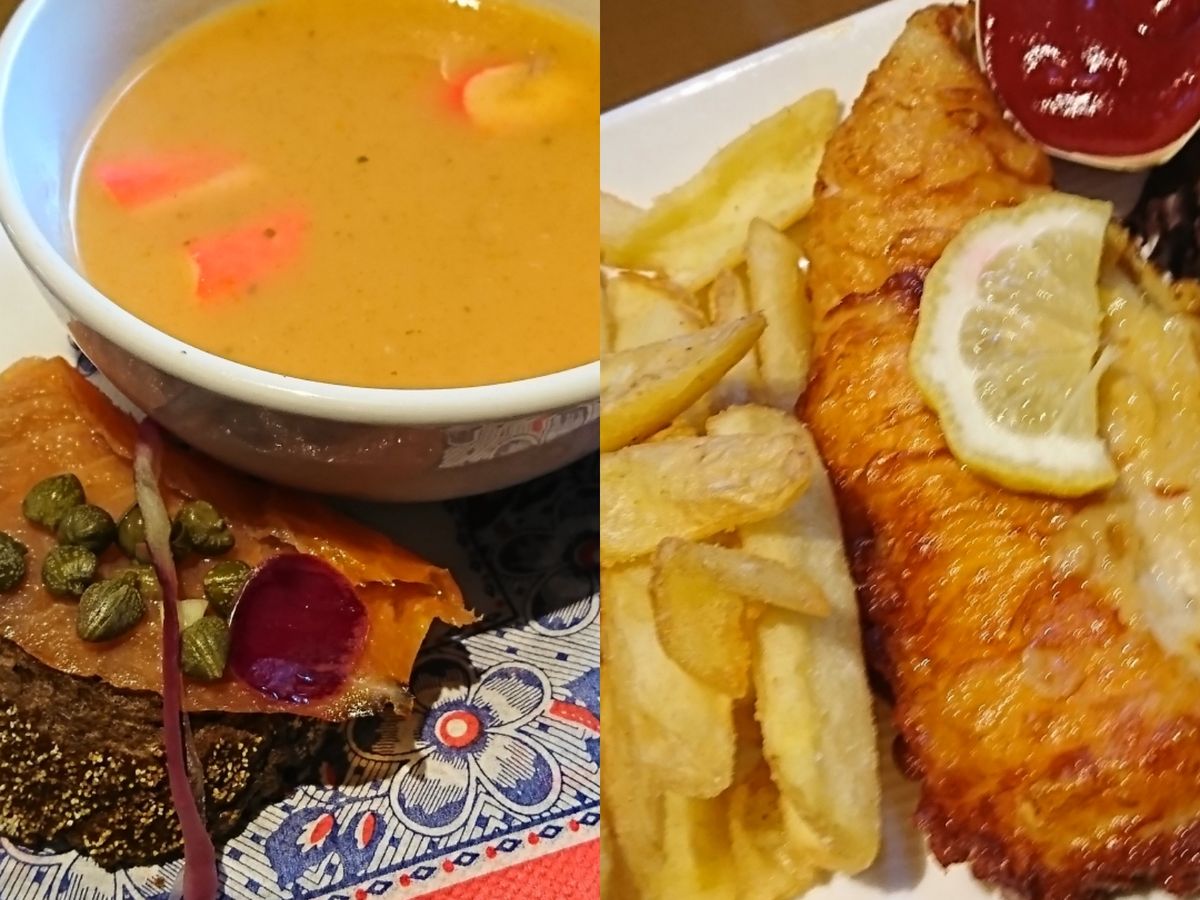 漁村のフォーレンダムでは、お昼にいただいたフィッシュ&チップスがおいしかったです。他の街でよく見る白身魚をちいさなブロックに切って揚げたもの以外に、フィレ(3枚におろした状態)を出しているお店があり、私はフィレを置いているお店に入りました。ジューシーでよかったですよ!(^^)!。また、手作りアップルパイもなかなかでした。