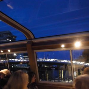 おいしい夕食を食べながら運河の街アムステルダムを巡るツアー。乗船時はまだ明るかったのがだんだん日が暮れていき、あちこちライトアップされるのが美しい。