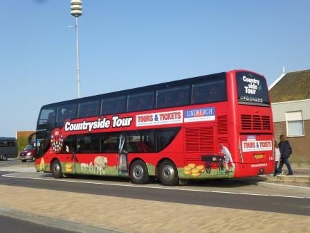 さて、ツアーは、他の国でもよくみかけるCitysightseeingロゴつきの赤色のバスでした。このバスを満杯にして出発。最初に風車村に向かいました。案外すぐについてびっくりでした。