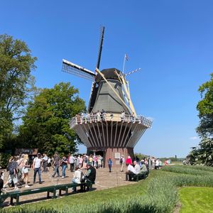 園内はとても広く、その中にたくさんのチューリップが至るところに咲いていました。典型的な形のチューリップだけでなく、花びらがギザギザになったチューリップなど、様々な種類のチューリップも見られ、面白かったです。園内にはレストランや小売店などがあり、食事もできます。お土産屋さんも点在してます。ミッフィーのグッズばかりを扱っているミッフィーハウスもありました。風車も一つあり、今回の旅行では風車村の方へ行く時間はなかったので、そこで近くにいた人に写真を撮ってもらい、満足しました。観光客でにぎわっていますが、敷地は広いのでベンチに腰掛けてのんびりと過ごすこともできました。
