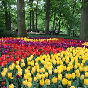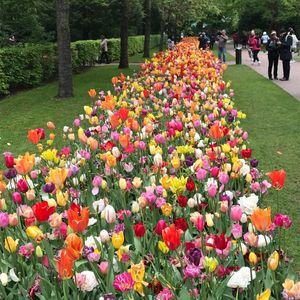 4/26日のツアーに夫婦で参加しました。9時前に受付に到着すると既に長い列ができていました。列の長さ割にスムーズに受付を終えバスにてキューヘンフォフ公園に向かいます。車中、ビデオと運転手さんの軽妙なご案内がありました。バスは広い駐車場の中で最も入り口に近い場所に止まります(帰りも同じ場所)。はやる気持ちを抑えとりあえず入り口で記念写真を取り園内に。私達は時計回りに園内を回りました。入口左手で移動式の自動演奏パフォーマンスがあり子供に人気でした。パチパチと写真を取りながら園内散策。水の流れる森の中にはチューリップ以外の植物も綺麗に管理され植えられています。しかしなんと言ってもチューリップ!その数、その種類、圧巻です。チューリップは群生で植えることでその美しさがアップしますよね。園内には、食事が取れる場所、温室、風車などがあります。(4月末といえど結構気温は低く、風も吹いてますダウンがあったほうがいいと思います。)