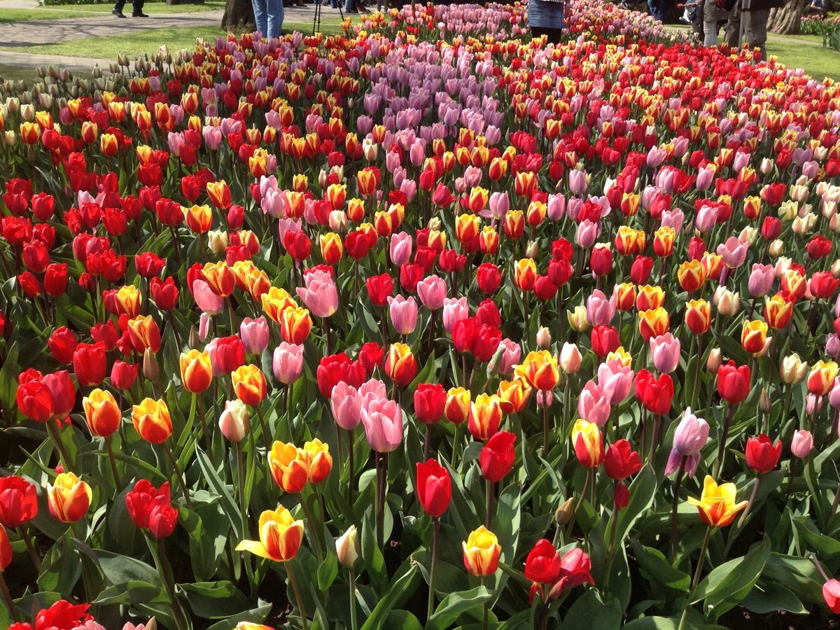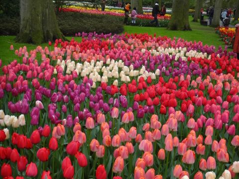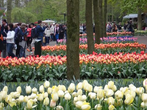 この公園を見たくてオランダ旅行を計画しました。5月上旬の訪問で、バスガイドさんの説明によると、例年ではチューリップを見るには少し遅い時期でしたが、2013年は例年よりも寒かったらしく、訪問時はチューリップが満開でした。公園到着後は、公園内のマップ(有料)を購入し、マップの右方にある風車を目指しました。広大なチューリップ畑は園外にあるため、所々にあるビューポイントから写真撮影ができます。園内には何カ所かレストランもありますが、屋台もたくさんあり芝生やベンチで食事を取ることができるので食べるところには困りません。3時間のフリータイムではとてもすべてを見きれませんが、子連れだったのでちょうどよい時間だったと思います。なお、アムステルダム現地のツアー会社は観光客で混み合うので、集合時間前に余裕を持ってチケットへ交換しておくとよいと思います。また、ツアー会社の集合場所からバスへは少し歩くのですが、係の人の誘導後すぐにバスへ向かわないと、1台目のバスに乗り遅れるかもしれません。私達は1台目のバスに間に合いましたが、すぐに満員になったため乗れなかった人が何人もいました。