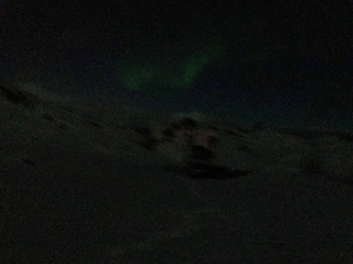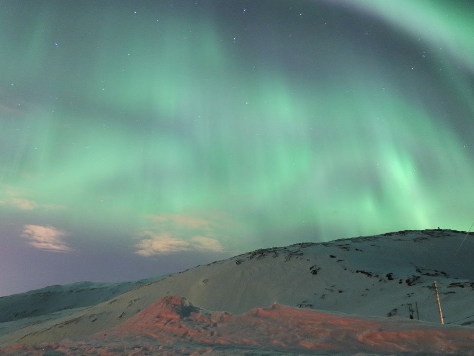 自分で事前にダウンロードしたオーロラアプリによると、その日は10段階中「レベル2」ということで、かなり絶望的な気持ちで参加したのですが、小回りが利くミニバスの長所を活かし、雲の流れやオーロラの状況に応じて素早く移動して常にベストスポットで観ることができました。とてもオーロラに詳しいガイドさんで、「あと15分くらいしたら、ここに帯が来るはず!」と言って皆で待っていたら、本当に突然現れて感動しました。アプリ予報が低くても、このツアーなら自分から「ハンティング」しに行きますし、その日のオーロラのピーク時間帯(私の時は0時くらい)までかなり粘って待つので、1箇所だけに滞在し定刻になったら早々に街へ戻る他のツアーよりは、はるかにオーロラを観れる確率は高いと思います。