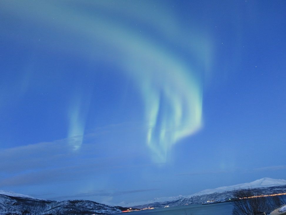 1月3日、トロムソの市街地は朝から雪。極夜なので昼間も暗くクリスマスのイルミネーションが雪に良く映えています。念のため午後2時ごろオフィスに行くと、気さくなお兄さんが名簿チェックしてくれて、6:20にここに来ればいいと紙に書いてくれました。催行を迷う事はまるで無しの様子。6:30集合、クッキーが配られ、準備は良いか?皆んなオーロラ見たいか?あのゴージャスladyについて行って、グッドラックとお兄さんに見送られて出発。降りしきる雪をまともにフロントガラスに受けながら北へ2時間。雪は海から来るから、雪に向かって突き抜けると止むとの事。本当に降りた所は海岸で、星と満月が見えていました。でも雲が次々湧いてくる。雪の積もった崖を降り、波打ち際で海風を受けながら待つ事2時間。ガイドの逞しいお姉さんは、ずっとカメラを撮っています。忍耐が大事と何度も言って。寒い人はバスで待機。一旦諦め、バスに戻り別のスポットに行くとの事。クッキーとホットチョコが配られました。外でサービスするので寒いなーと思いつつふと振り返ると、わー‼︎雲が開いてオーロラが横にたなびいていたのです。満月の光で肉眼で見る色は白っぽくなっていましたが、生き物のようにくねって姿を変える様を30分くらい見る事が出来ました。iPadにnight camera のアプリを入れそれで撮影。手で持ってでしたが、一応肉眼より、緑がかった姿をとることができました。ガイドさんが翌日メールにfacebookやMEGAに入れて送ってくれた写真は、こんなに綺麗だったんだと改めて感動。カメラの方が肉眼より発色が良くなると分かりました。もっと光が強ければ月明かりにもめげず肉眼でも緑やピンクがみれるそうで、もっと見たい気持ちになりました。勿論次もこのツアーを利用します。