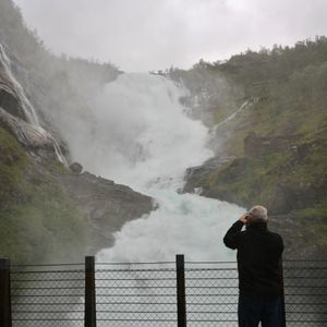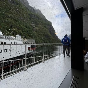念願のフィヨルドツアーでしたが、残念ながら雨と霧で、あまり景色は見えませんでした。それでも滝などの見どころに出来るだけ近づいて運行してくださっていました。
