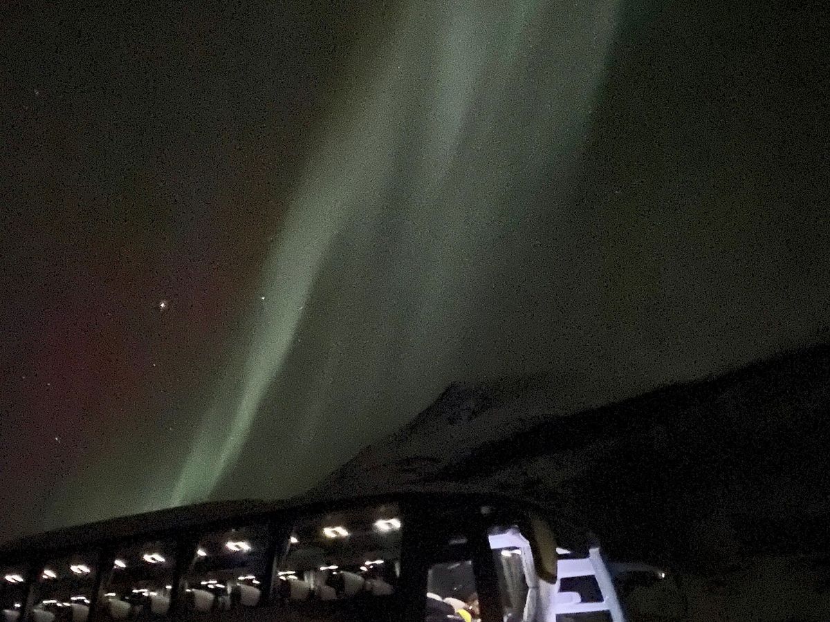 18:15 集合でしたが、ちょっと遅刻して18:25くらいにバスとガイドが到着。いろんなツアーのバスが次々と来るので注意が必要です。バウチャーを見せてバスに乗り込みます。満席でした。ガイドはメキシコ人の女性とドイツ人の男性、なんともグローバル。トロムソから1時間走ったところで、ガイドが「見えた!」というので窓の外を見ても何も見えず。停められそうなところでバス停車、みんな下車すると、見えました。うっすらと白っぽい光が。でも薄くてオーロラと言われないとわかりません。あとはそのスポットにひたすら4時間近くいることに。移動がありませんでした。見れたのでもうほかの場所には行かず、そこでオーロラの変化を見ることに。次々と出たり消えたり、形を変えたりして、確かに飽きることはなかったです。いちばん感動したのは、薄緑と薄い赤が混じった細い線が伸びて、ゆらゆら揺れて動いた時。写真で見るような鮮やかさはなかったですが、やはりオーロラはとてもきれいでした。途中ホットチョコレートとクッキーがもらえました。本当に寒いのでココアは美味しかったです。12時過ぎにバス停に戻り、ホテルに歩いて帰りました。治安がいい国でよかったです。オーロラは運ですね。夕方に雨やみぞれみたいなのが降って、夜もずっと雲で難しいかと思っていましたが、晴れ間を見つけてバスが移動するので、町の天気が悪くても見れる可能性があります。