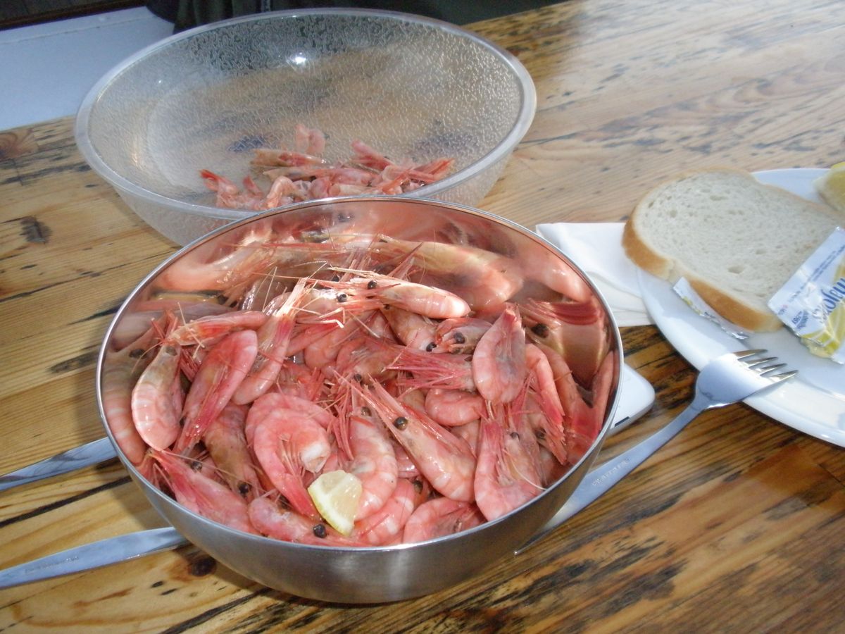 まったく、ノルウェー人があんなにエビ好きとは知りませんでした。パンにバターを塗ってその上にたっぷりとエビをのせて食べるのです。私の前に座ったフレンドリーなノルウェー人方が、「ノルウェーでは、ホームパーティーでよくエビを食べるのよ。」と教えてくれました。日本人の私としては、そのままいただく方が好みでしたが。でも、そう聞いて見てみると、エビをのせたサンドイッチをノルウェーのいろいろな所で売っていました。このツアーで、人生で食べたことの内ほどのエビの量を食べることができました。新鮮でおいしかったです。でも、夏でも夜になると急に気温が下がるので、ダウンのコートでちょうどよかったです。