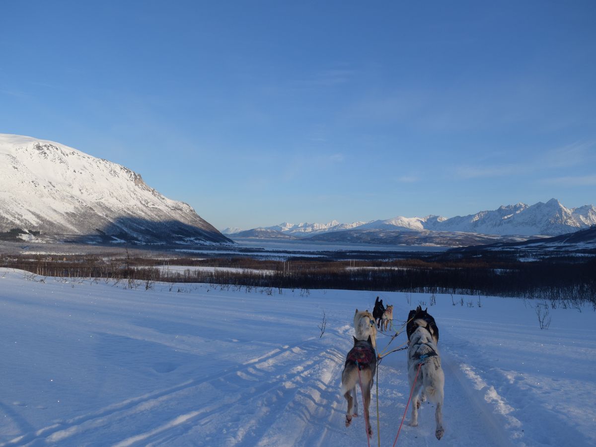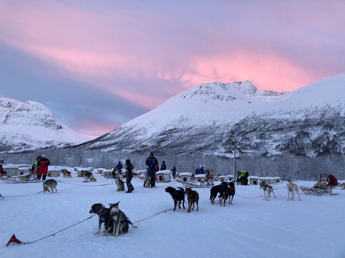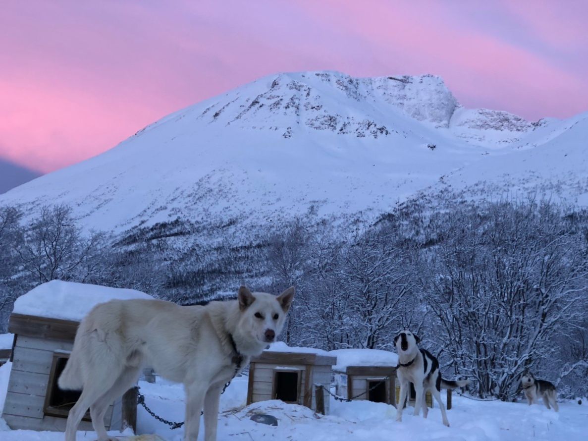 天気も良くて、白銀の世界をハスキー犬と走るのが最高でした。周りの山々に朝日が当たり朱色に染まりきれいでした~!!