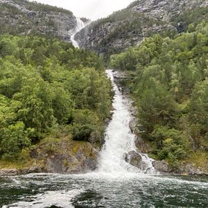 翌朝は雨。ただ、朝食後の出発時には止んで、クルーズ出航時には晴れになり、素晴らしい眺望をずっとデッキ上で楽しみました。寒かったですが手袋持参で良かった。フィヨルドの険しい山の景観、その連続はソグネフィヨルドを凌ぐスケールで、登山趣味の自分も船上からの景色に呆気に取られる凄さでした。