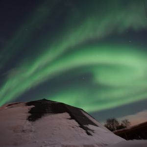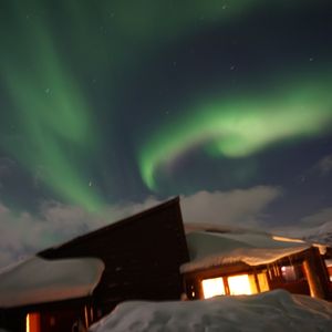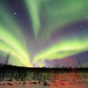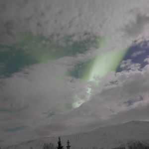 天候はツアー出発の夜7時になってもかわらず、結局何とか雲の切れた時間帯にオーロラ観測を試み、高感度のカメラ(小さな懐中電灯と共に是非持参すべき)で何とか見れた程度であった。しかしガイドやドライバーの何とか見せたいと頑張る態度は大変好感を持て、スエーデン国境近くまで出向いた模様。結局ホテルに帰り着いたのは深夜1時過ぎ、6時間超のツアーであった。途中のトイレ休憩もままならず、少し大変だけど、これは絶対に参加すべき。帰国の日は晴れていたので、真冬でなくても3月、4月でもあなたの運次第でOKと感じた。この時期の参加は札幌の雪まつり程度の服装でOK、夕食は済ませて参加を。
