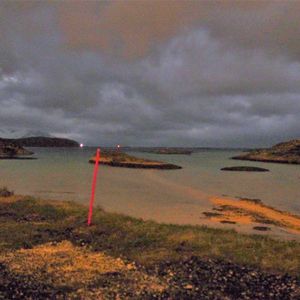 22:30を迎えた頃、島の頂の上空に星がはっきりと顔を出しました。つまり空がある程度の規模で晴れた=オーロラが見えるかもしれないということで、ガイドさんが急いでカメラを持ってきて撮影を行います。