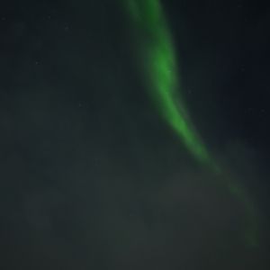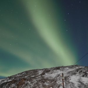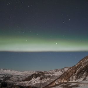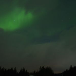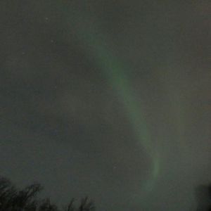 食事後にキャンプの外に出ると、遠くの空に、まるで虹のように緑色の縦の筋が1本。5分間程度でしたがようやく目にしたオーロラ。