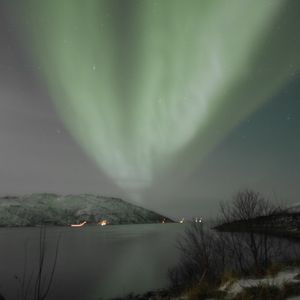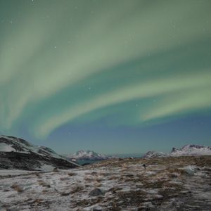 1時間半ほど走ったところで、周りを山に囲まれた、開けた湿地帯でバスを降りました。遠くの空に星が複数、確かに見えます。オリオン座だと判別もつくほどでした。月も顔を見せています。はじめ夜空を撮影した際には、雲の縁がうっすらと緑がかって写っていました。その後数分して、空がくっきりと顔を出すと、カメラがオーロラを捉えていました。ただ、肉眼ではその姿を確認することができませんでした。