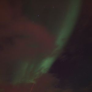 トロムソを離れフィンランド国境近くまで行き、3か所ほど止まりました。1か所目はオーロラ見れずすぐに次の地点に移動。2か所目では、肉眼では見えないものの、写真に撮ると緑+赤いオーロラが写りました。少し目が慣れてきたら肉眼でも見えるようになってきました。3か所目に移動すると、肉眼でも十分見えるオーロラが出ていました。あまり強くはない弱めのオーロラですが滞在中は2方向にオーロラをずっと見ることができました。
