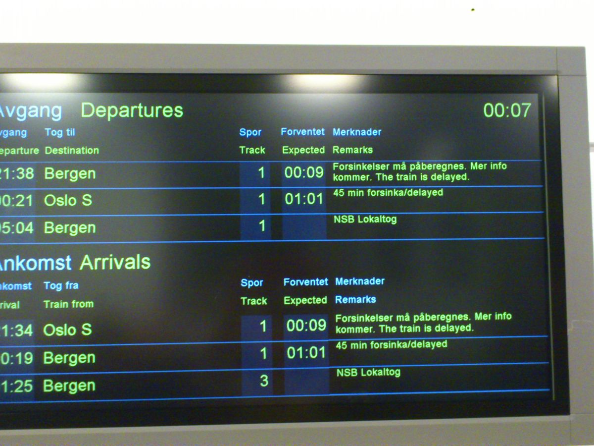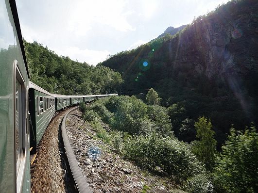 2 往路、オスロを出発してから3時間半ほど経ったころGol駅で停車。猛暑の車内、又は炎天下の車外で待つこと1時間以上、「電力が供給できない。」とのアナウンスあり。後続列車に乗り換えさせられる。観光シーズンなので、当然後続列車も満席。大半の乗客は座席を確保できず、残りの時間を立ったまま過ごす。その後も、何度か停車し、結局予定時刻を2時間半遅れてミュールダールに到着。