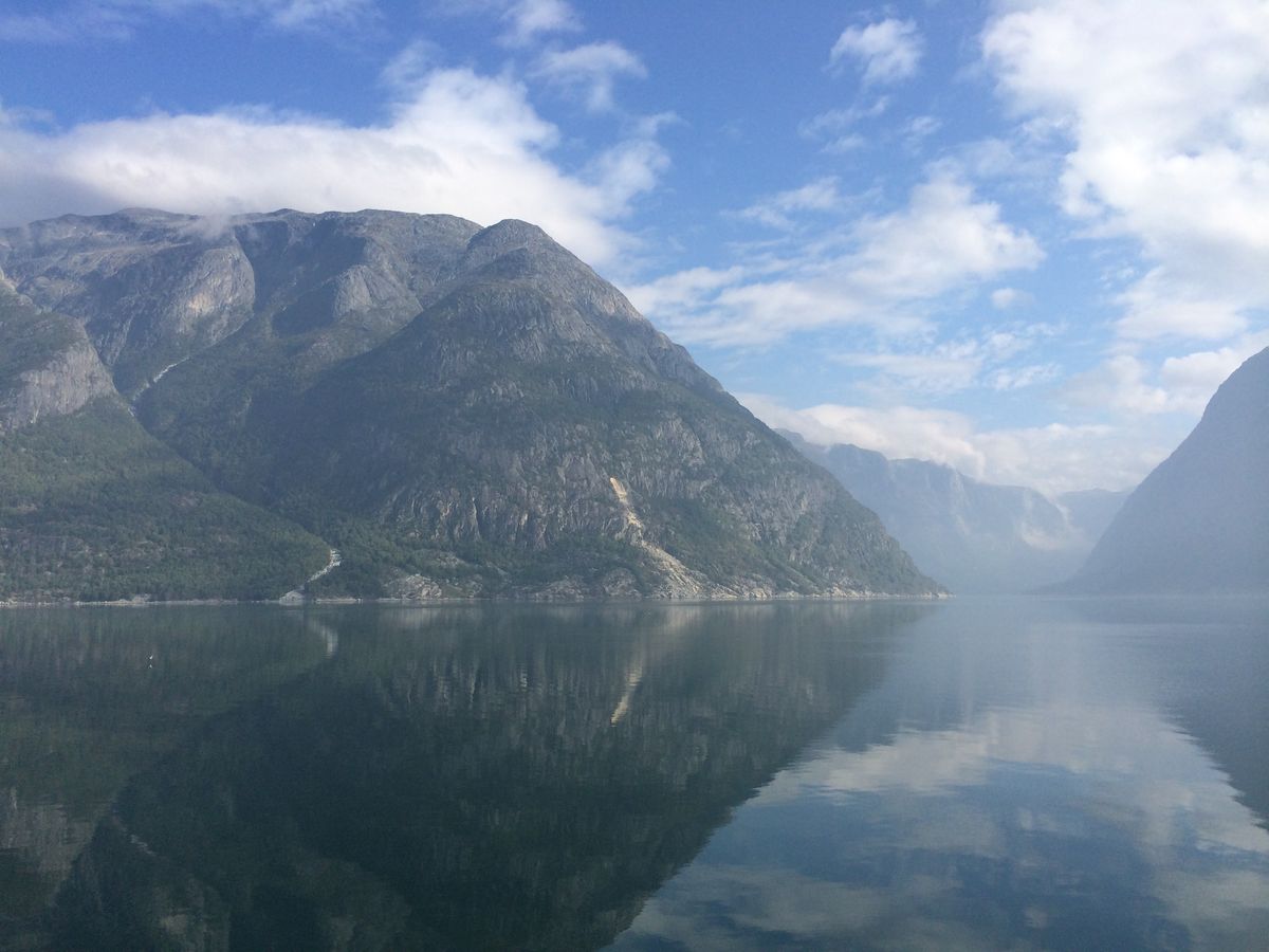 まず船に乗ってフィヨルドを下から楽しみます。水面に映るフィヨルドはとても綺麗でした。