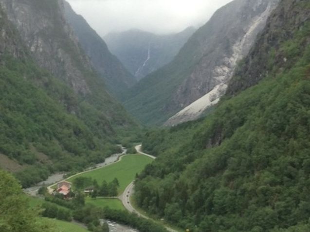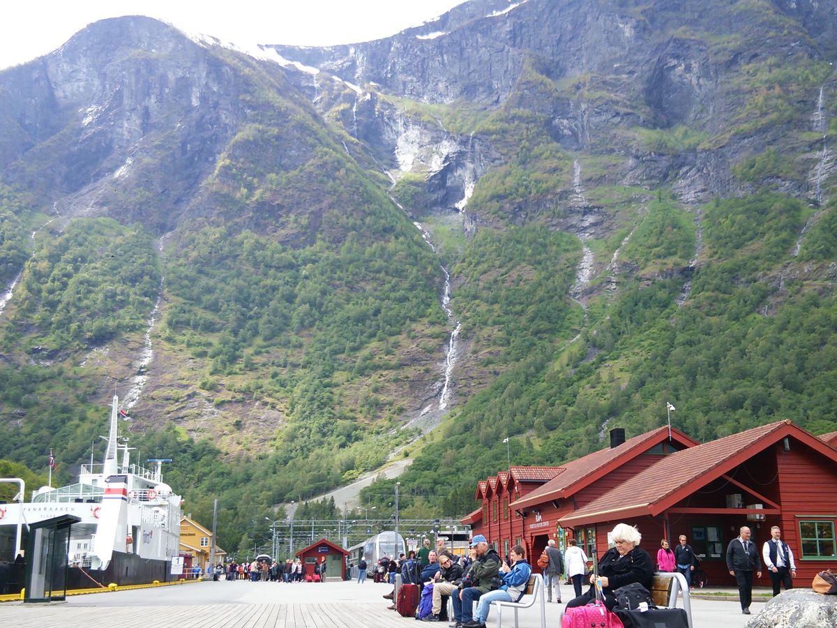 朝オスロ出発8時、そしてベルゲン着21時過ぎの長旅。チケットは前日に駅の受付で入手。場所は駅の目立つ所、無愛想なパリとはえらい違いで、スタッフから声かけてくれます。ノルウェーの皆さん誰でも英語が流暢しかも親切。この時期、電車は満席。Myrdalまでは車窓をみながら4時間の旅、途中右手に氷河が見えます。標高の高いMyrdalは、晴れてても寒かった。電車乗り換え、Falmまで1時間、今度はどんどん下り。途中の滝で、5分ほど写真停車。左手には雄大な渓谷が続く。今度はフェリーに。乗換の要所要所に、スタッフがいて、確認すればサポートしてくれます。隣に超豪華なクルーズ船がいたが、我々の船はちっこいフェリー。約2時間、滝や氷河でけづられた絶壁をみながら 、穏やかな中をクルージング。下船すると、すぐ前にバスが待ってます。急勾配の中での景色がまた絶景。締めはVossからの電車。Voss駅周辺も素敵で、散歩も。キャリーバッグを持っての旅でしたが、そんな旅行客がほとんどで、重いこと以外は苦労しない。
