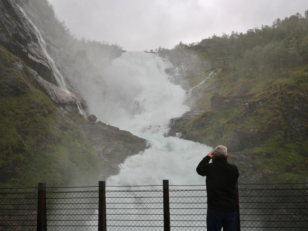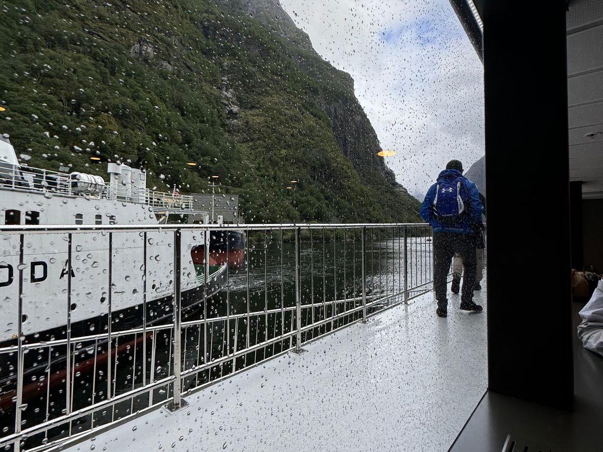 念願のフィヨルドツアーでしたが、残念ながら雨と霧で、あまり景色は見えませんでした。それでも滝などの見どころに出来るだけ近づいて運行してくださっていました。