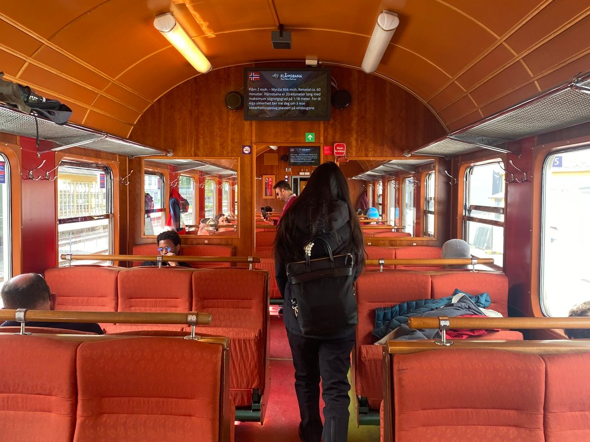 8:29ベルゲン発の15分前くらいに電車に乗りましたが、余裕を持って座れました。進行方向左側の席に座りました。海が見える側で、風景を楽しむことができました。