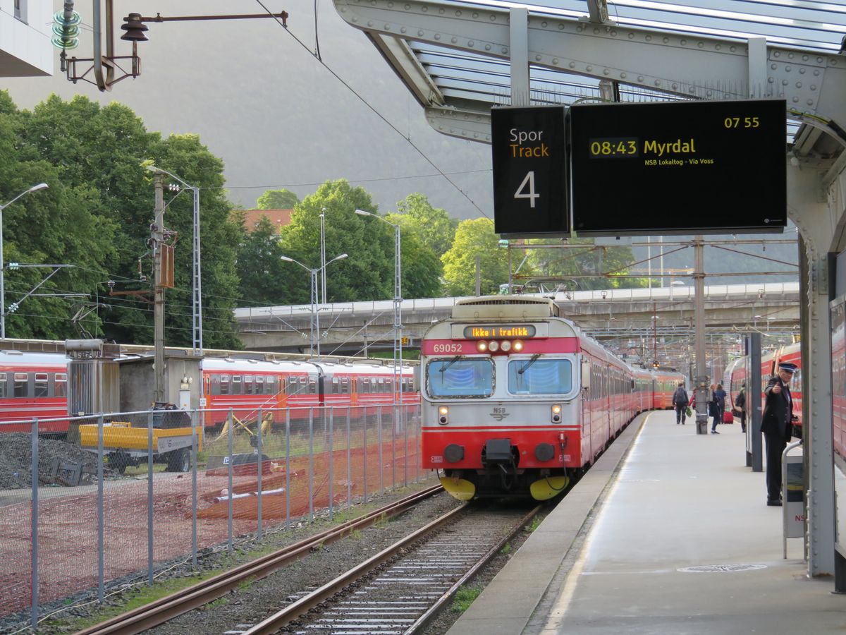 オスロ発ベルゲン着の周遊。チケットも前日にスムーズにゲットし、朝、準備万端でホームへ。すると、私たちの指定席である10号車がなぜか連結されておらず、列車は9号車でおしまい。