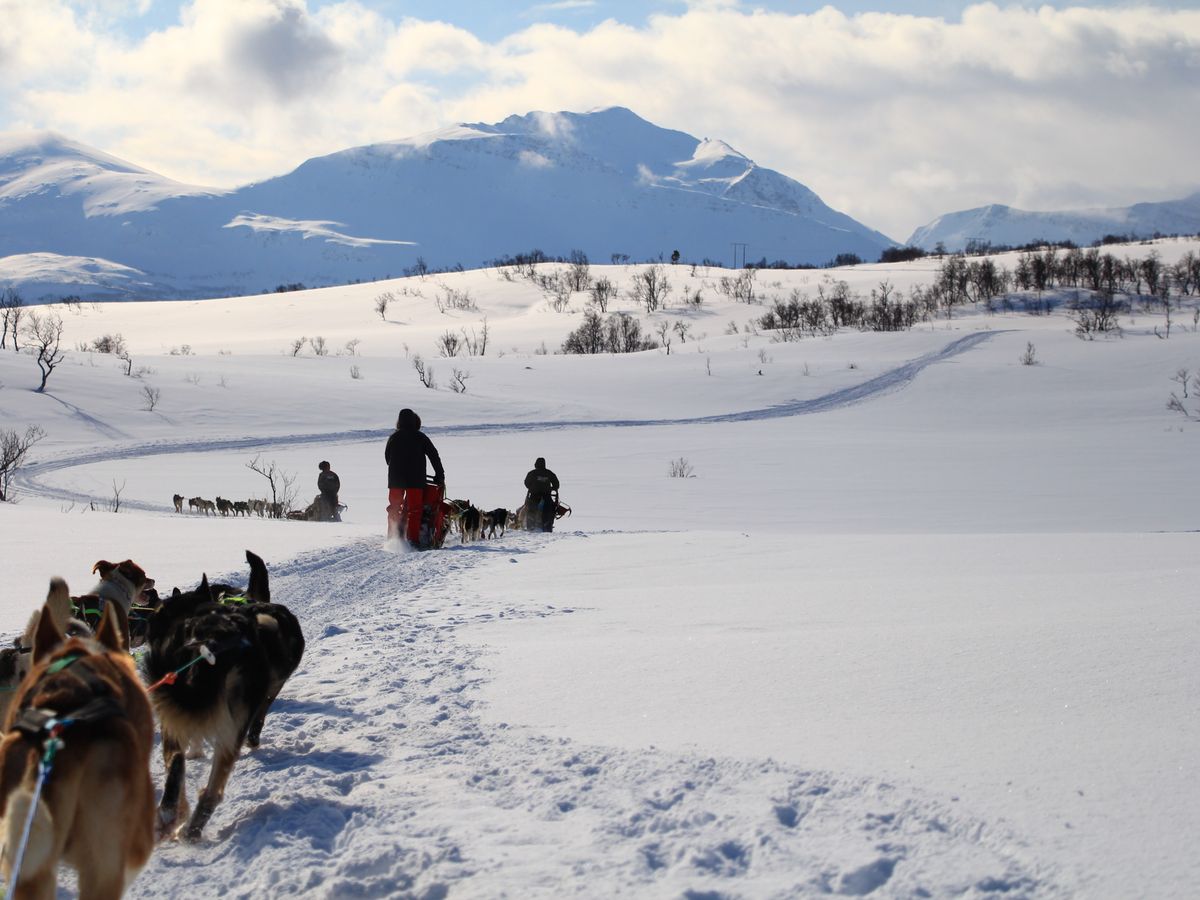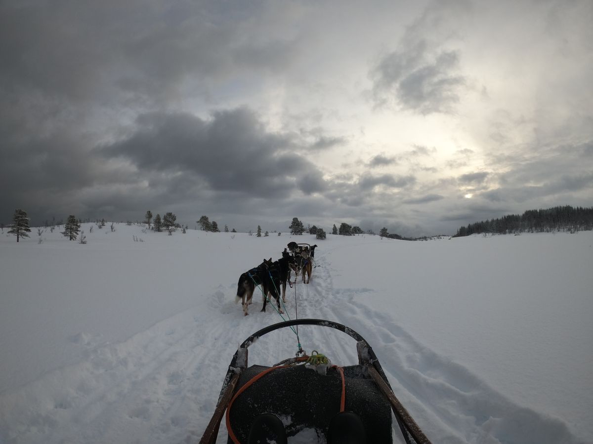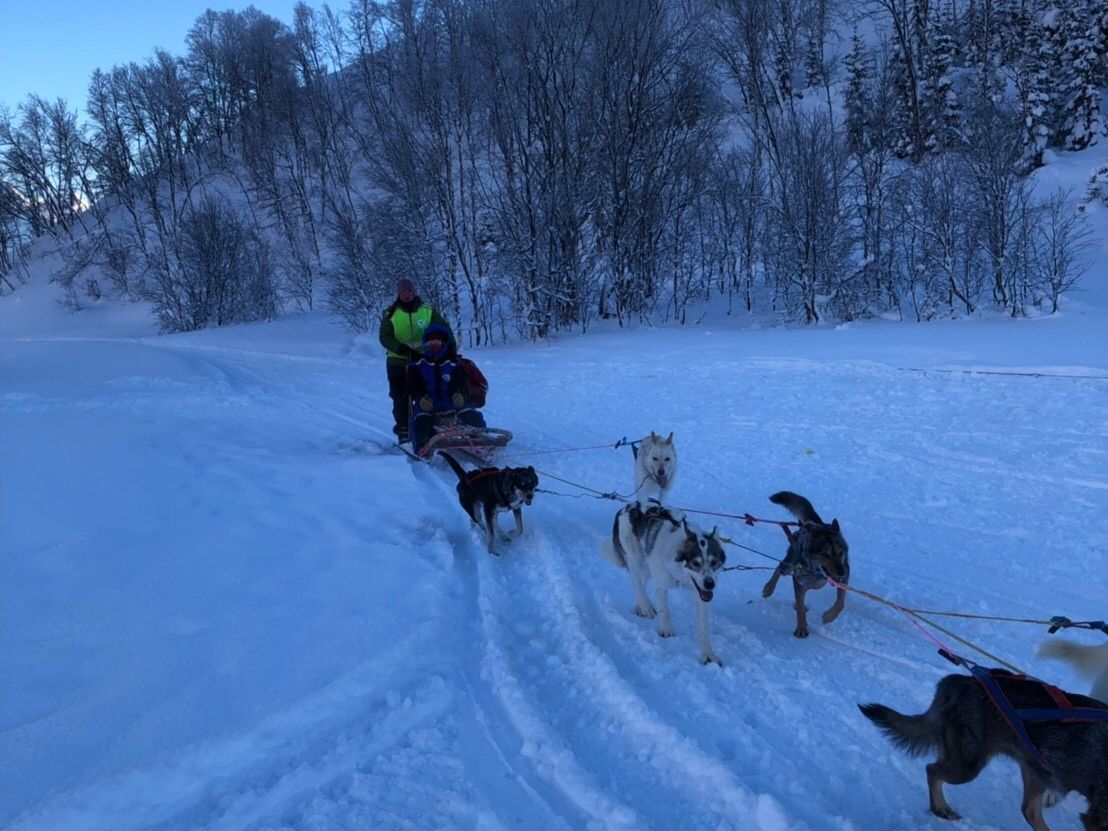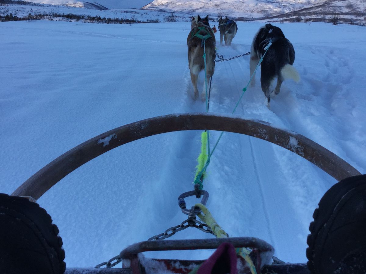 朝は9時半からなのであまり急がなくてもよく、集合場所も都市部のわかりやすい場所にあったので迷うことはありませんでした。現地では、ガイドの方が犬ぞりの乗り方も教えて下さり、安心して体験できました。説明は全て英語ですが、わかりやすく説明してくれることと、操作方法もいたって簡単であったためなんら問題はありません。体験コースは雪山の銀世界を堪能しながら2人一組で交互に操作するというもので、片方はかごのようなものに乗ってリラックスしながら犬たちの走っている姿を後ろから楽しめます。犬ぞりのスピード自体としてはさほど速くないので走りながら2人で会話を楽しむこともできます。また、対岸に都市部があるため、綺麗なオレンジ色の灯りの景色を眺めて楽しむことも一つの楽しむポイントです。ツアー終了後は犬との触れ合う時間が設けてあり、犬たちが非常に人懐っこいため、もちろん犬好き方もそうでない方にも犬たちの可愛さを存分に味わえるのでオススメです。最後に昼食として、伝統料理のサーミというスープとガトーショコラケーキを楽しむことができます。美味しかったです。