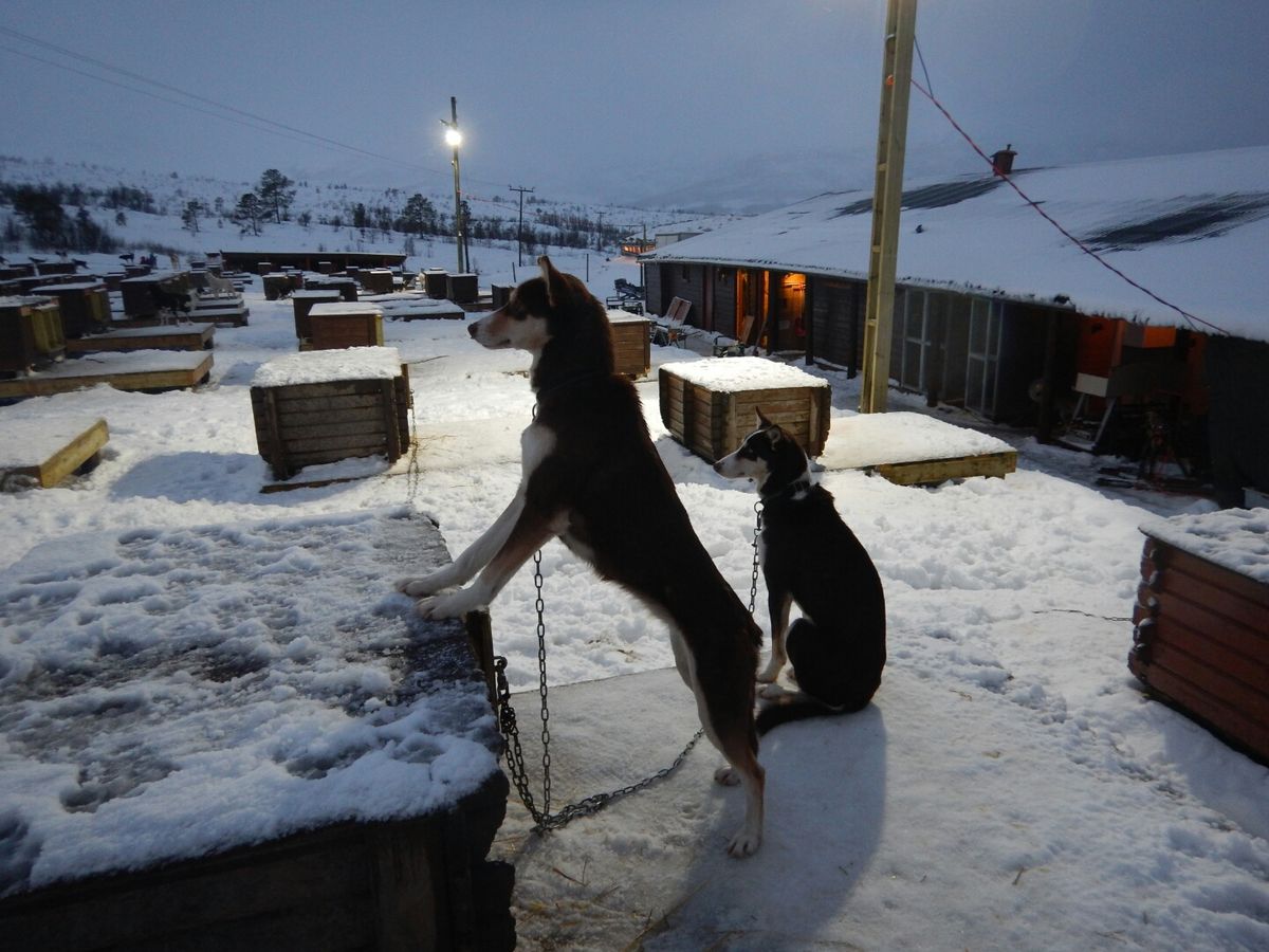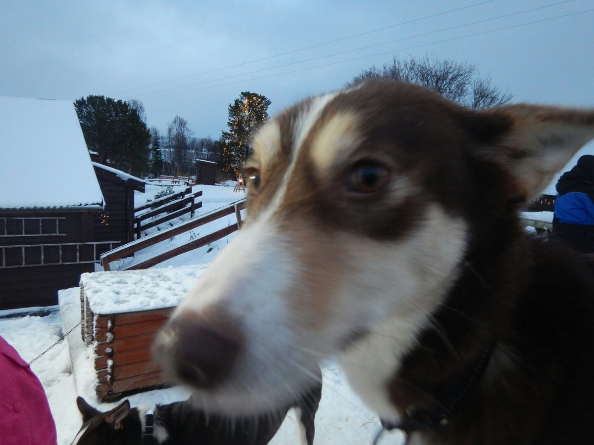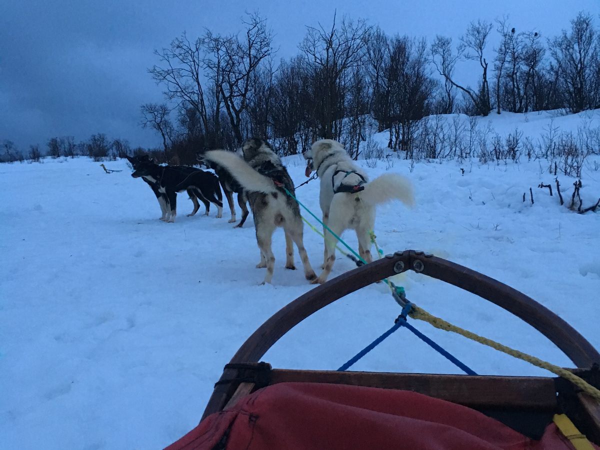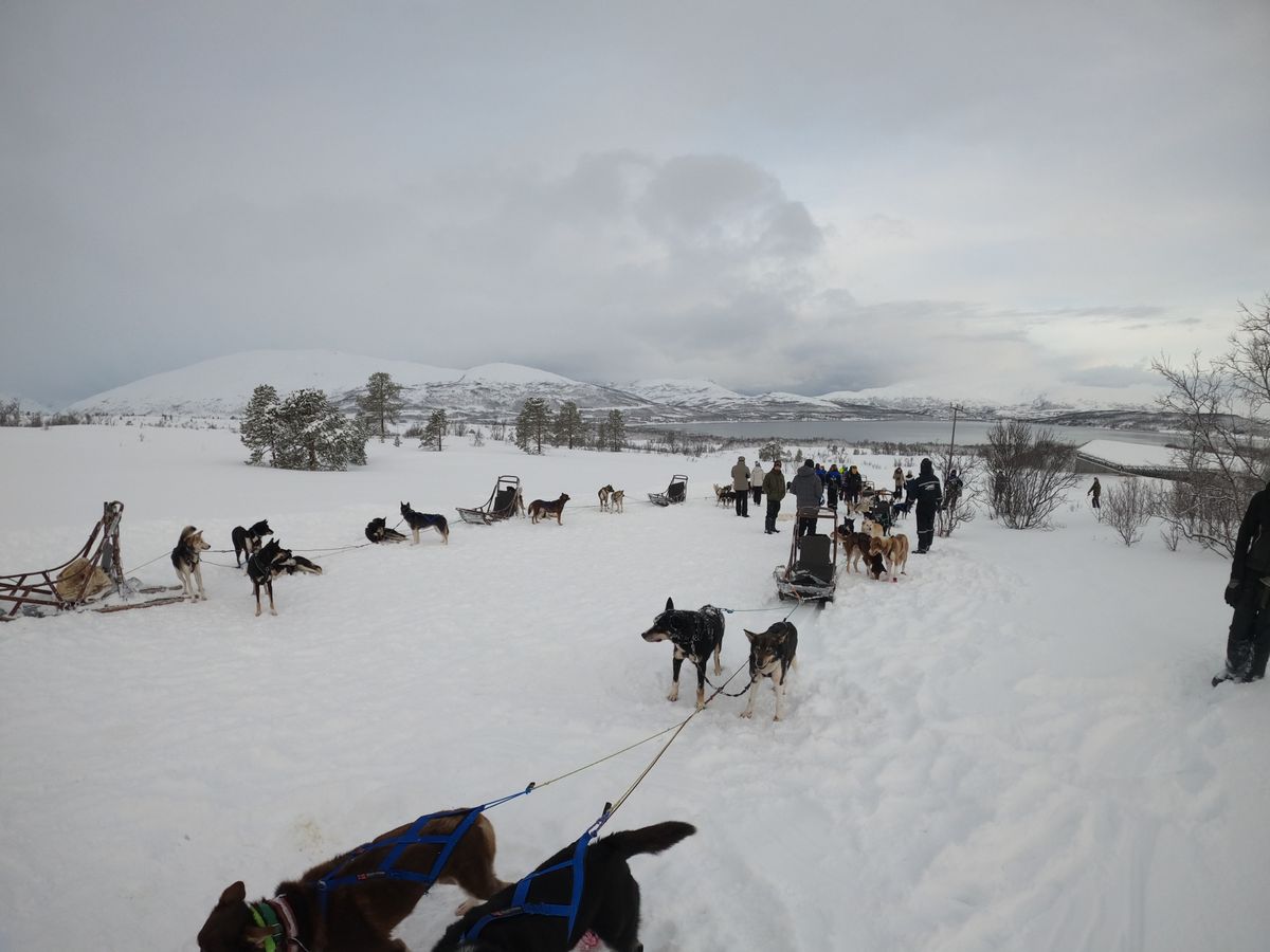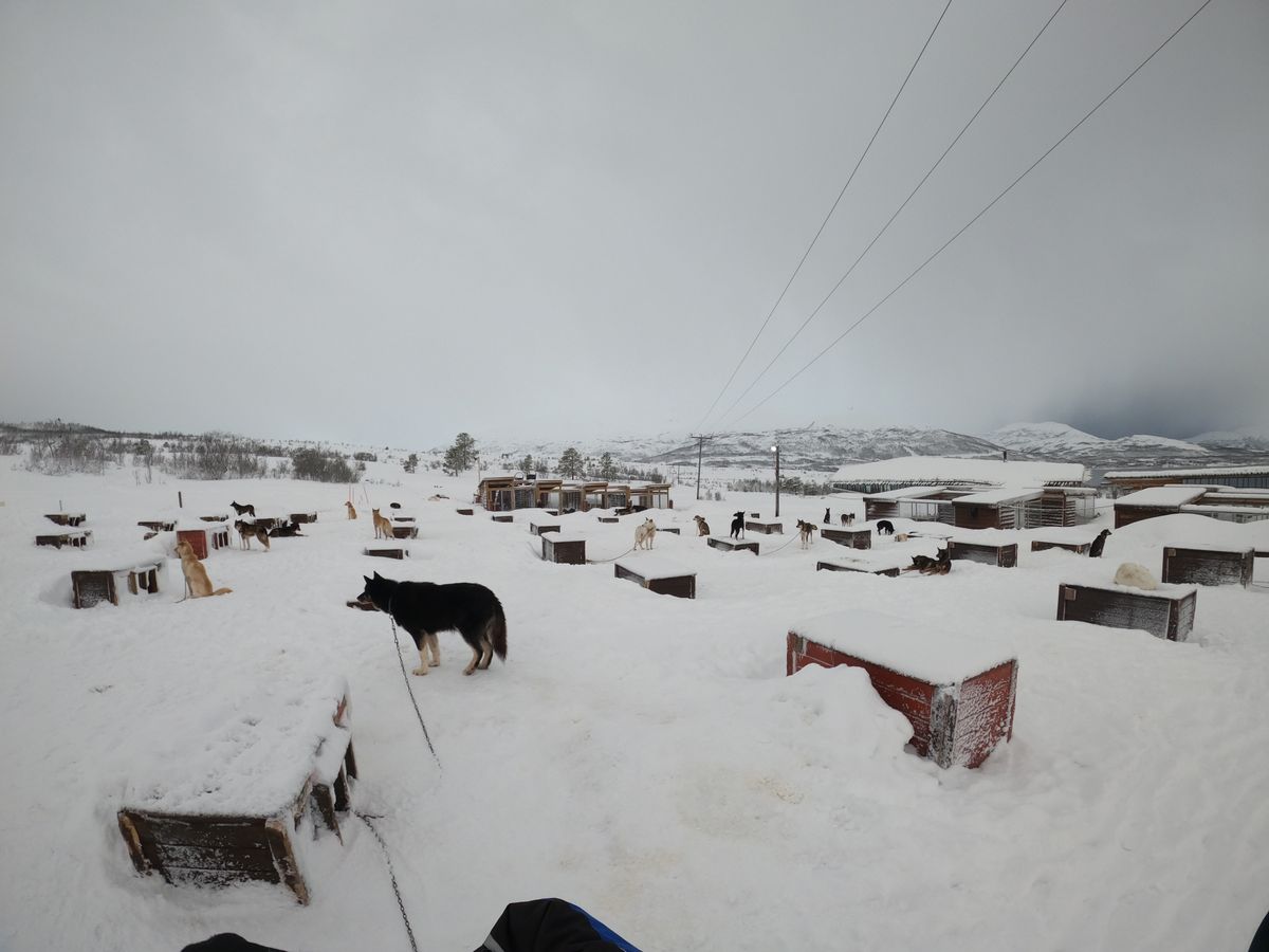 トロムソから30分程度の移動で現地着。一応防寒、防水のブーツ・ツナギを借りる事が出来ます。(帽子と手袋も借りられます。全て追加料金なし) 見た目汚いですが、それでも借りる事をお勧めします。犬は凄く可愛いのですが凄く匂うので(笑)