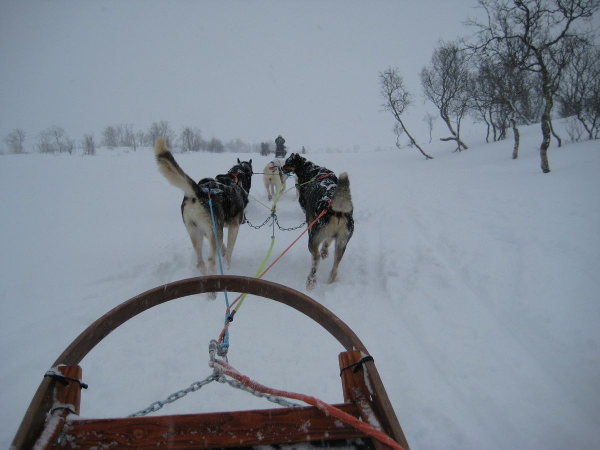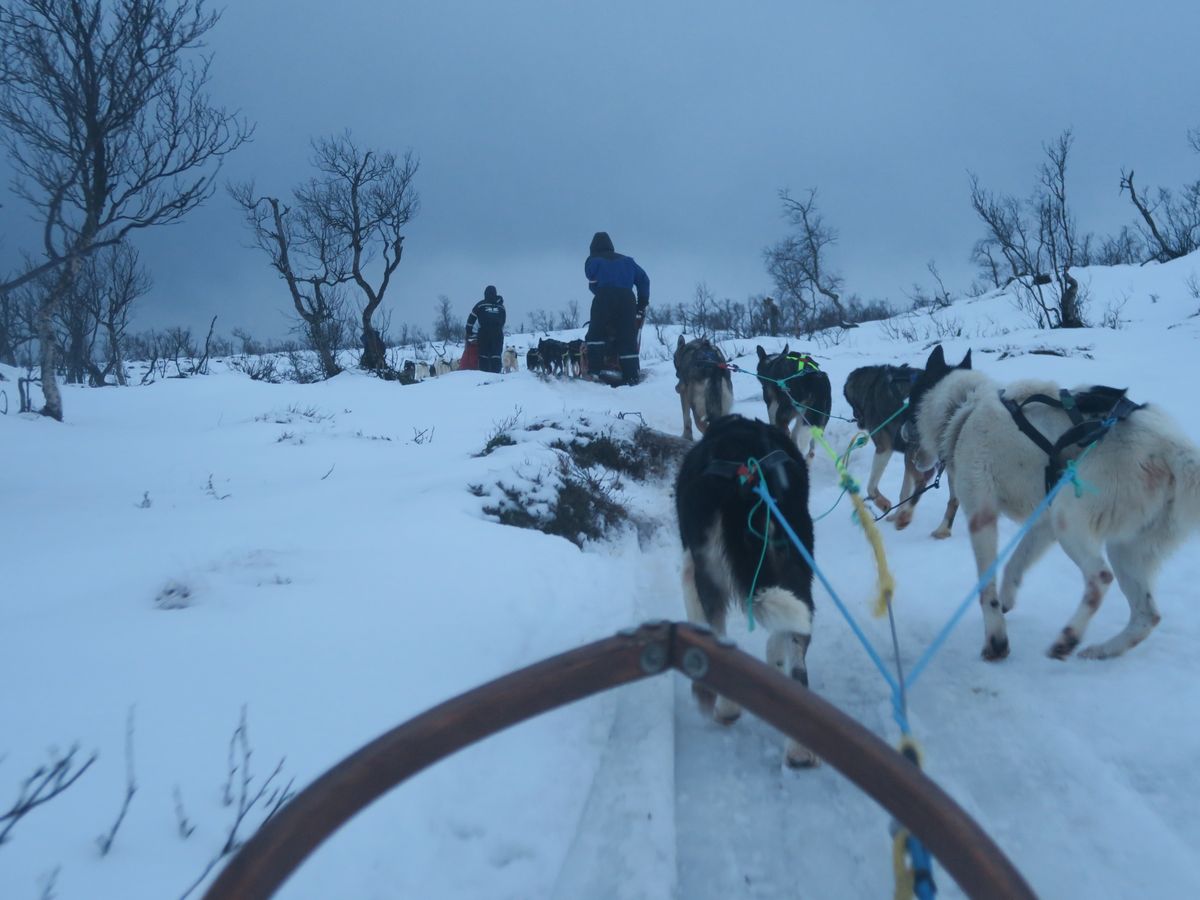 良い意味で、見るとやるとでは大違いの感じがあります。走っているワンちゃんは一生懸命で、後ろから見ているととても健気に思えてきます(写真)。当日は雪がちらついていて、ゴーグルを持っていって正解でした。昼食に出たトナカイシチューもとてもおいしかった。走っている犬の他にも、沢山の犬がいるので犬好きにはたまらないでしょう。