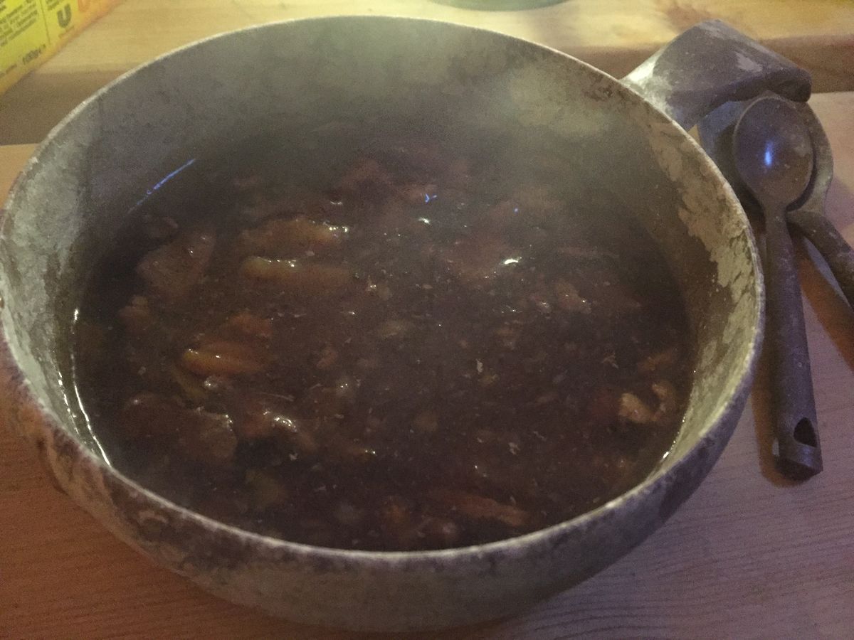 ソリの後の食事はスープとパンとデザート、コーヒー(紅茶)。ボリューム十分。