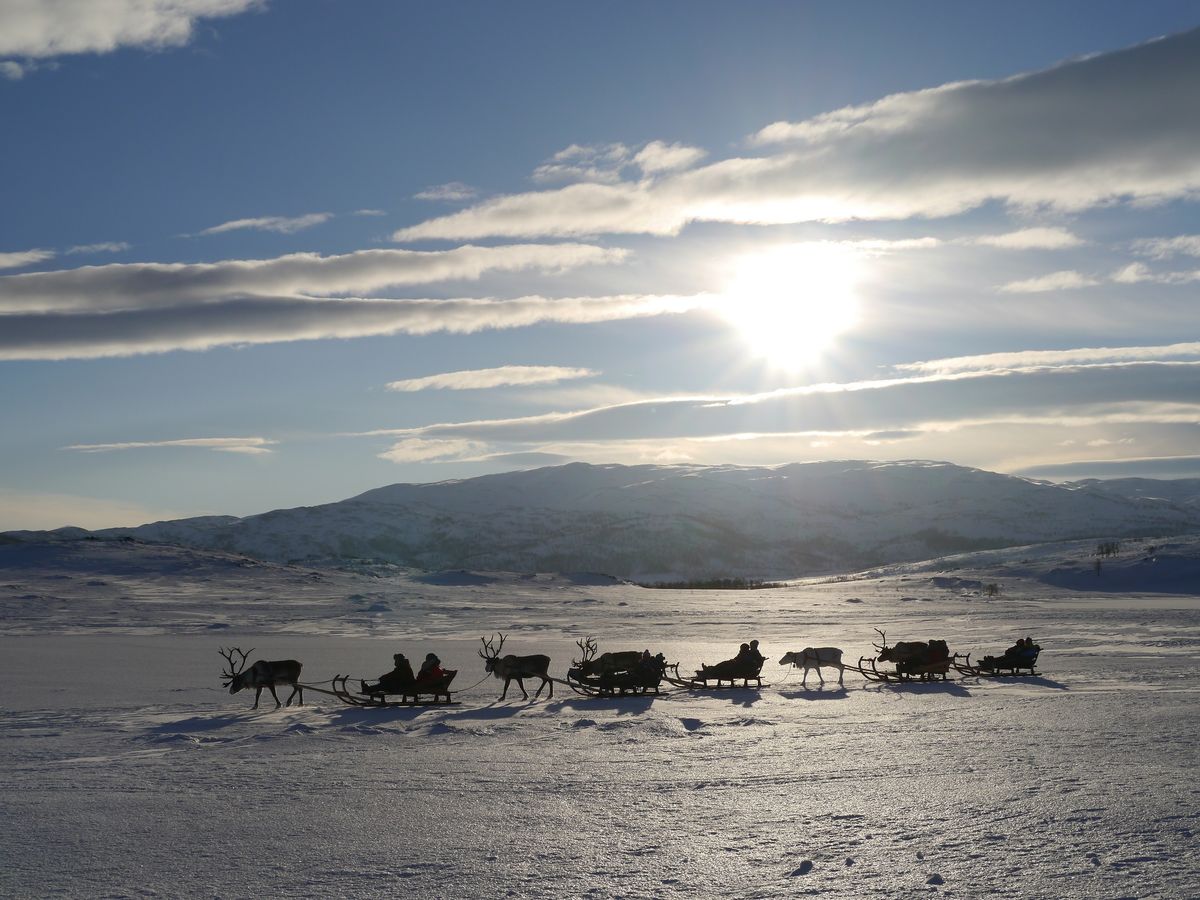 中型バスでピックアップ後、30分ほど走ったサーミ民族居住の地域に行きます。そこでドライバーさんはガイドさんと交代し、まずはガイドさんに案内され防寒着のレンタルオフィスに行きます。私は自前の防寒着でしたが、厚手のスノーグローブだけ借りました。半数くらいの方が上下防寒着とグローブ・スノーブーツをレンタルされてました。その後、トナカイソリに乗るためにバスで5分ほど移動し、サーミ民族の方々に案内され、半分はソリで出発し、残りはサーミ民族の暮らしの様子を見たり、移動テントに入ってみたり(焚き火でものすごく煙いです)、投げ縄で狩りの練習をしたりします。ソリのグループが戻ってきたら交代してトナカイソリで出発です。その後、トナカイやサーミ民族の方々と記念撮影をしたりした後、より大きなテントに移動して、「ビードス」を食べました。食後は各自マシュマロを焼いて食べたりホットチョコレートを頂いたり、外でソリ遊び(近代的な普通のソリ)をしたりビーチを散策したりした後、レンタルした防寒着を返却してバスで帰りました。トナカイソリだけでなく、サーミの文化をいろいろ見ることができて、期待していた以上にとても面白いツアーでした。