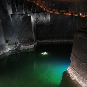 岩塩の採掘は700年以上続き、坑道の総延長は約300 km、空洞の数は2,000以上、また最深部は327 mに達する広大な地下採鉱場です。公開されているのは深さ135mまで、20以上の部屋や礼拝堂を巡る約3.5 kmの見学ルートを見て回りました。見学ルートの各所では採鉱作業の様子の再現や、実際に使われていた梯子やトロッコなどを目にすることができます。神秘的な地底湖(塩分濃度30%)や採掘後の空洞を利用して創られた地下の礼拝堂はその大きさに目を見張りました。