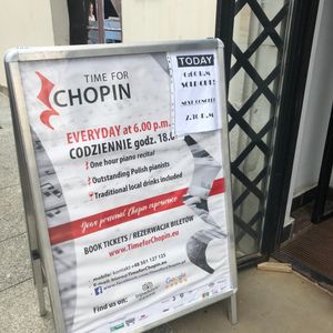小さな部屋で間近でピアノを聴くことができます。ピアニストは若い女性で上手でした。軍隊ポロネーズや英雄ポロネーズなど、難曲を含めて演奏しました。場所は分かりづらく、昼に確認した時は現地ガイドさんと一緒に探しましたが、夜になると看板が出ていて目立っていました。とちゅうでドリンクタイムがあり無料でシャンパンかジュースをいただくことができます。時間は長すぎず短すぎず、料金は安く、おすすめです。