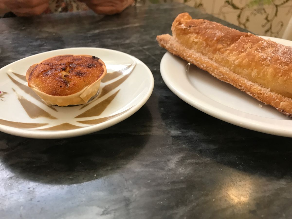 最初にエッグタルトで有名な老舗でエッグタルトを食べました。外側の皮がパリパリで、中は、素材の味がよく活きたエッグタルトで、とてもおいしかったです。ティーポットがこぼれやすいので、要注意です。