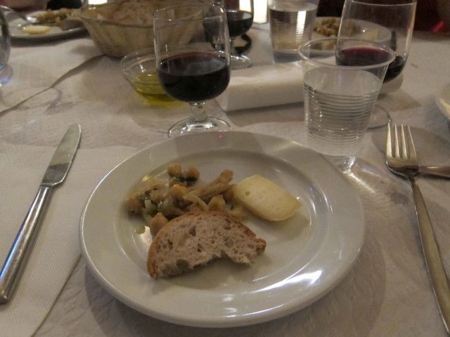 最後のおつまみの盛り合わせコースでようやく席に座れて、パンとオリーブ油、オリーブの実、チーズ、豆のサラダ、豚肉とソーセージが一皿ずつ出ました。ワインは1杯。もうこれ以上は出ないだろうというところで、退散させてもらいました。 色々な料理を試食できると思えばいいかもしれないが、酒に対してつまみが少なすぎるし、ガイドの講釈が長すぎる。英語が堪能でも辟易してくると思います。