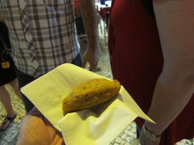 集合時間は4時15分でしたが本当は4時30分過ぎです、4時間くらい近隣のグルメスポットを案内しますが、食べれるものはほんの少しです。最初にさくらんぼ酒、次にワインとチーズ、ビールと豆などお酒の飲める人はいいですが下戸にはお勧めできあせん。唯一よかったのはリスボン一番のジェラートの紹介でした。