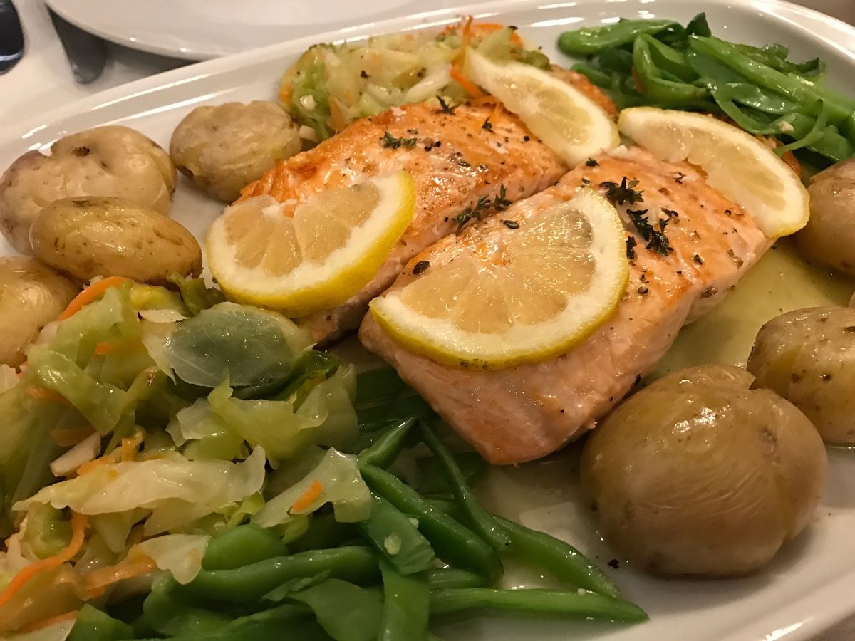 食事はワインとキャベツとジャガイモのスープとメイン(豚肉、サーモンと忘れてしまったけれどもう一つも魚 からチョイス)、デザート(フルーツサラダ、チョコレートケーキ、あとは忘れた からチョイス)、コーヒーまたは紅茶でした。私はメインは豚肉、デザートはフルーツサラダを選びました。量が多くて食べ切れませんでしたが、美味しかったです。