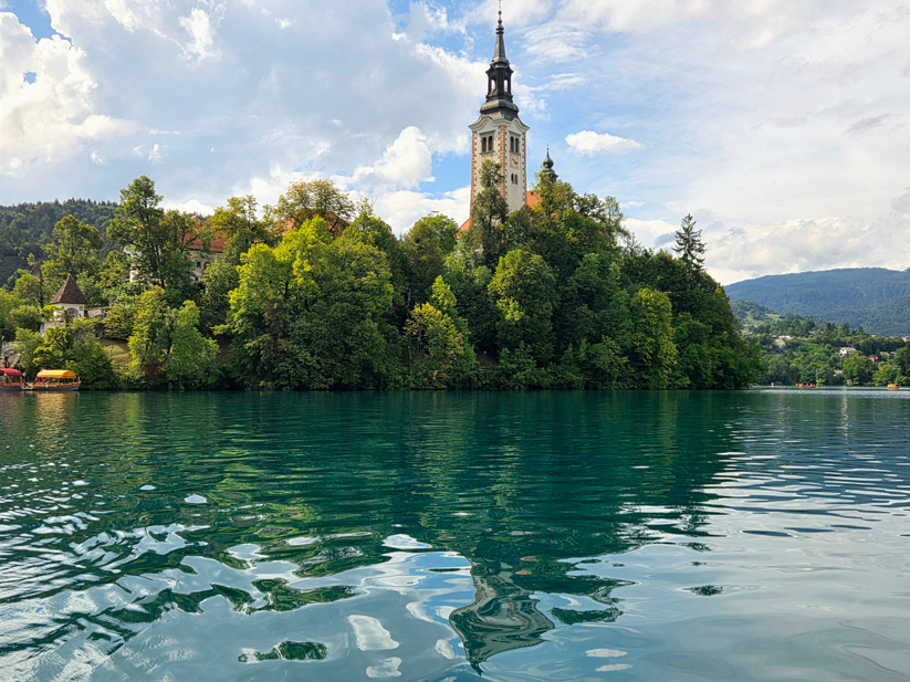 ブレット城で湖を上から見渡した後、ブレッド湖の真ん中にある島にボートで上陸。ここでも40分自由時間。屈強なお兄さんによる手漕ぎボートから眺める湖に浮かぶ教会がお伽話のよう。