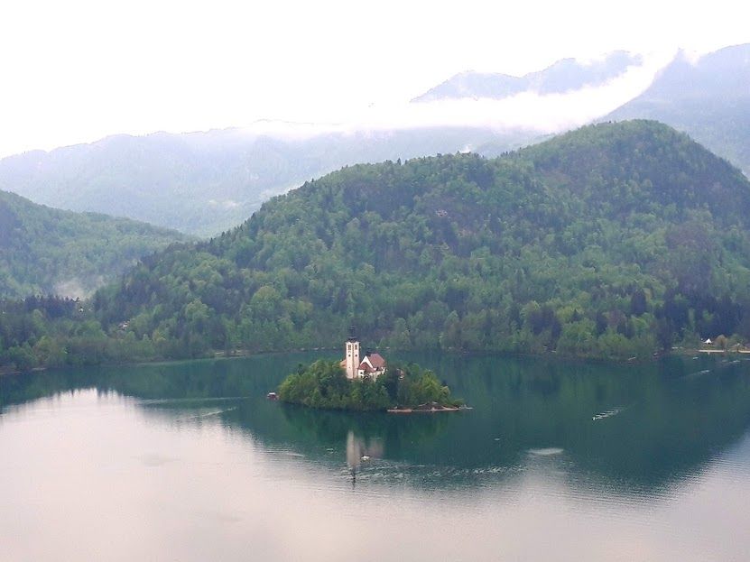 ブレッド城からは雨に煙る小島が見えました。雨が強いため、先にボーヒニ湖へ行きました。湖畔の教会を見学。教会の司祭に詳しいフレスコ画の説明をしていただきました。雨は次第にあがり、徐々にユリアンアルプスが顔を見せ始めました。再びブレッド湖畔へ戻り、昼食。ガイドさんに名物料理を教えてもらい美味しく食べました。湖畔から小島へ小舟で渡り、聖母被昇天教会でゆったりした時間を過ごしました。湖畔に戻ったころは、ブレッド湖と小島の背景に雪を被ったトリグラフ山やユリアンアルプスが顔を出し幽玄で感動的でした。再び雨が降り出し慌てて車に乗りホテルに送ってもらいました。