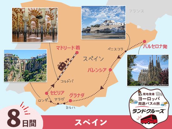 バルセロナ→ペニスコラ→バレンシア→グラナダ→マラガ→マルベーリャ→ロンダ→セビリア→コルドバ→マドリード