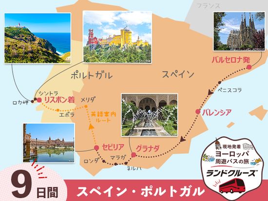 バルセロナ→ペニスコラ→バレンシア→グラナダ→ ネルハ→マラガ→ロンダ→セビリア→メリダ→エヴォラ→リスボン→ロカ岬→シントラ→リスボン