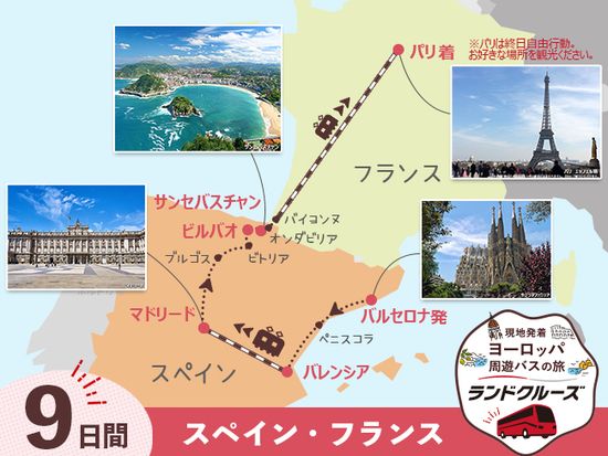 バルセロナ→ペニスコラ→バレンシア→マドリード→ブルゴス→ビトリア→ビルバオ→サン・セバスティアン→オンダリビア→バイヨンヌ→パリ