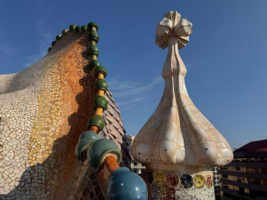 まるでドラゴンの背のようなユニークな屋根が広がる展望テラス。バルセロナ市街を望む絶好のフォトスポットです。