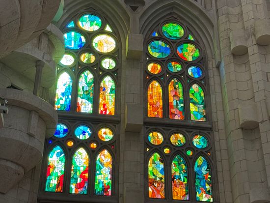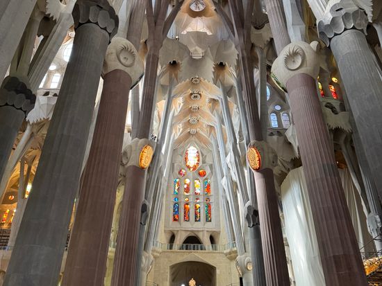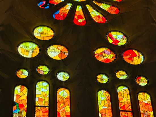 サグラダ・ファミリアの内部は、色鮮やかなステンドグラスが最大の見どころです。光が時間帯によって変化し、朝日が差し込む東側は青や緑の涼しげな色合い、夕日が差し込む西側は赤やオレンジの暖かい色合いで彩られます。ガウディの「自然の光を取り入れる」という設計思想が体現されています。
